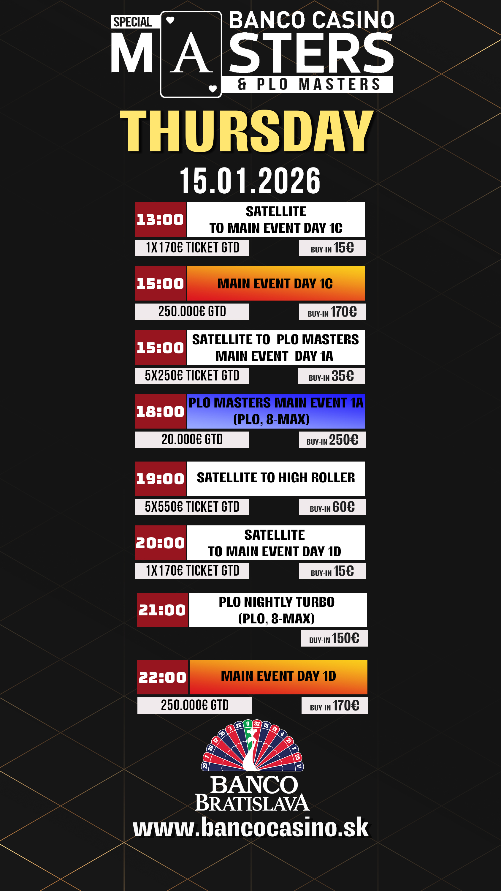 Najväčším ťahákom celého Banco Casino Masters je jednoznačne Main Event a ten garantuje 250.000€ a to len za 170 eurové vstupné. Ba čo viac pri každom flighte môžu prví traja postupujúci získať tzv. chipleader bonus v celkovej hodnote až 2.600€. Včerajšie dianie v druhom úvodnom dni patrilo Rostyslavovi Sabishchenko z Ukrajiny, ktorý si okrem postupu z prvého miesta odniesol z Banco Bratislava odmenu 1.500€. Včerajší flight zaregistroval 128 vstupov, z ktorých sme spoznali znova 13 možných šampiónov Masters. Dnes bude na programe 2 násobná šanca na postup a samozrejme sa bude rozdávať 2x 2.600€. Štart už od 15:00!