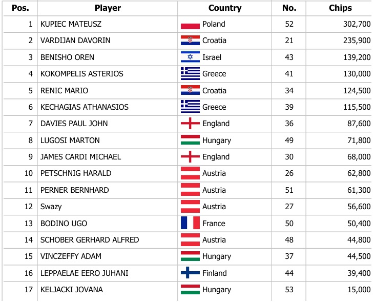 Včera bol aj na programe druhý úvodný deň PLO Masters, ktorý počas 9-tich levelov zaregistroval 33 entries a z nich sa do dnešného finálového dňa prebojovalo 33 hráčov. Do naplnenia 20.000 eurovej garancie chýba ešte 8.000€, no v dnešnom finálovom dni je otvorená registrácia prvé tri levely, takže ak milujete pot limit omahu, tak dnes spoznáme jedného šampióna PLO!