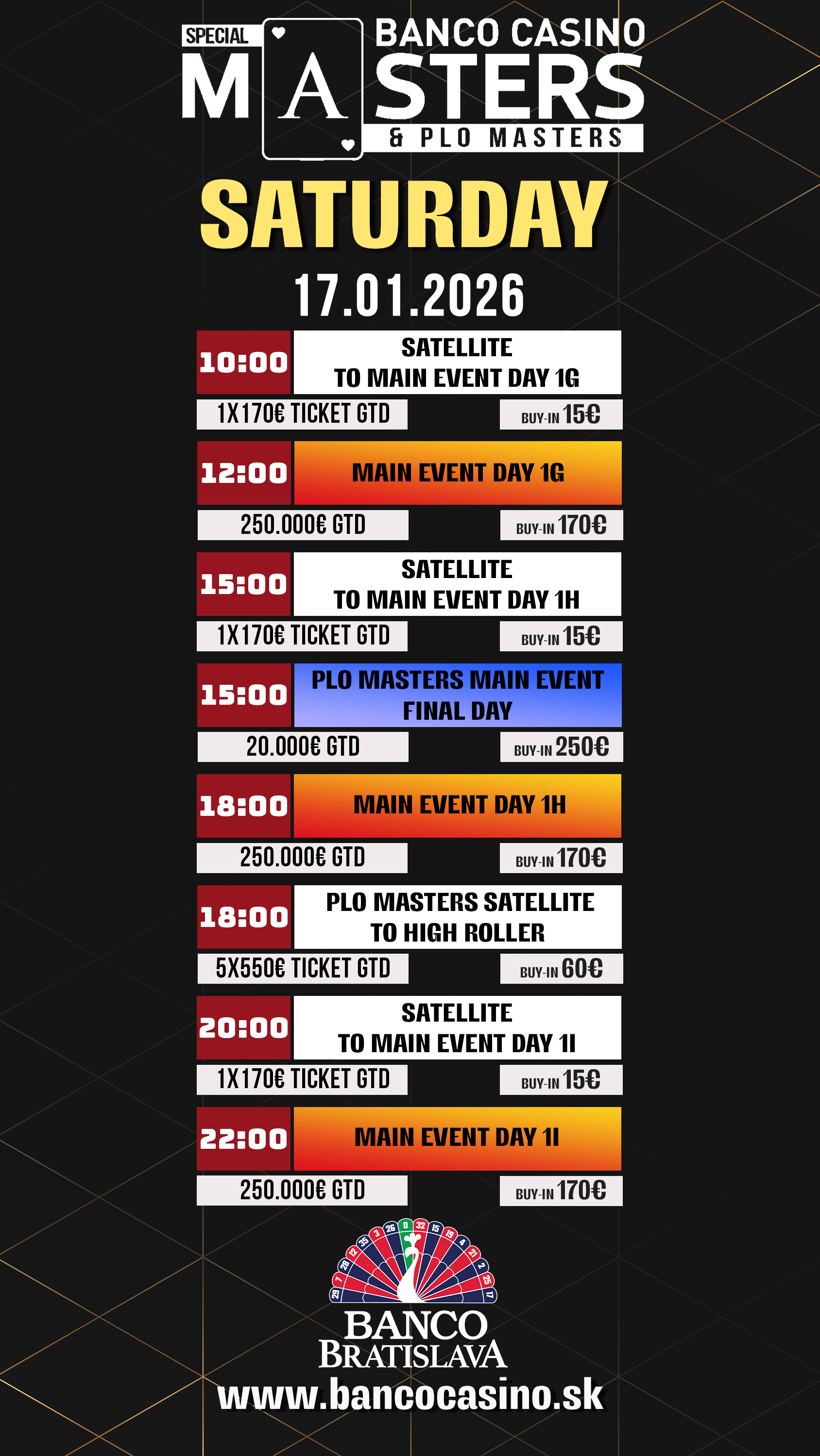 Main Event Banco Casino Masters s poradovým číslom 43 má pred sebou najsilnejší deň a v tejto chvíli ešte do pokorenia garancie chýba 115.000€. Doteraz 80 hráčov si zabezpečilo postup do zajtrajšieho Day 2. Dnes sú na programe tri možnosti ako postúpiť do zajtrajšieho druhého dňa a dnes sa budú rozdávať chipleaderské bonusy v hodnote až 7.800€. Chcete byť šampiónom Masters v úvode roka 2026?