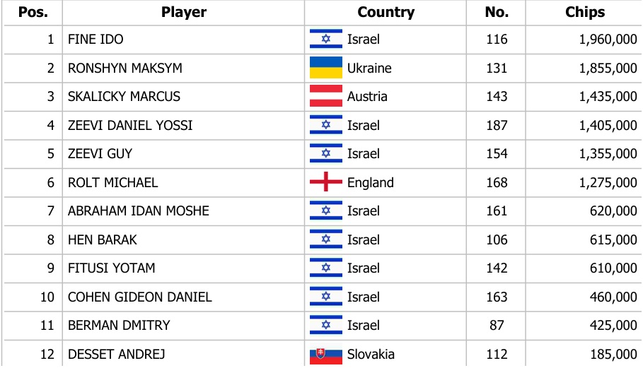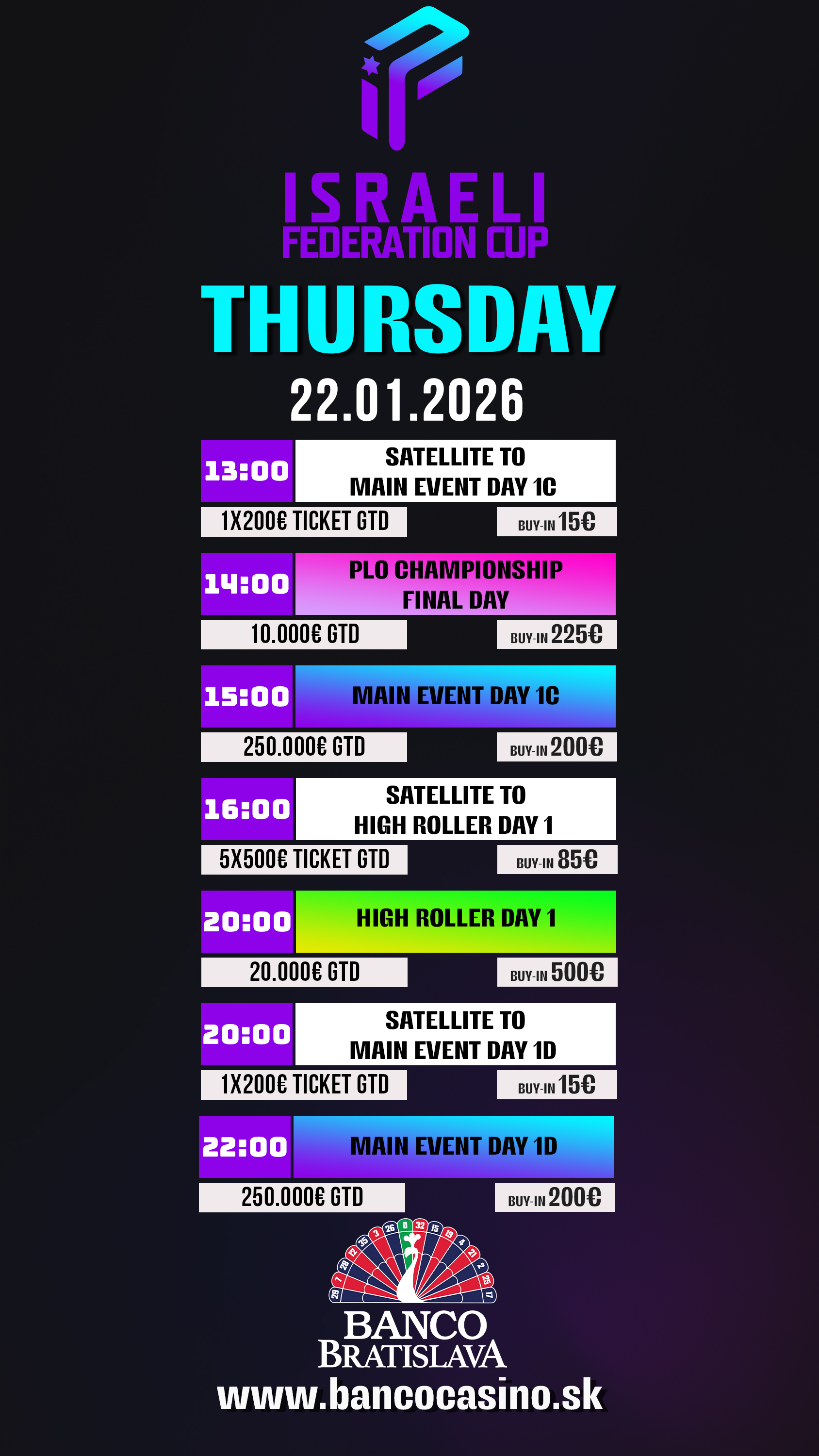 Main Event Israeli Federation Cupu pokračoval druhým úvodným dňom a ten zaregistroval 122 vstupov, čo prinieslo radosť 12 hráčom. Tí si zabezpečili postup do nedeľného Day 2 a už sa môžu venovať aj skvelým side eventom, ktoré si IFC nachystal pre návštevníkov Banco. Najväčší stack včera zabalil Ido Fine z Izraela a v tesnom závese za ním skončil nový šampión Masters Maksym. Dnes sú nachystané dve možnosti na postup v podaní regulárneho flightu 1C od 15:00 s polhodinovými blindami a ešte jedna šanca s prívlastkom turbo čaká na pokrových hráčov od 22:00 hodiny.