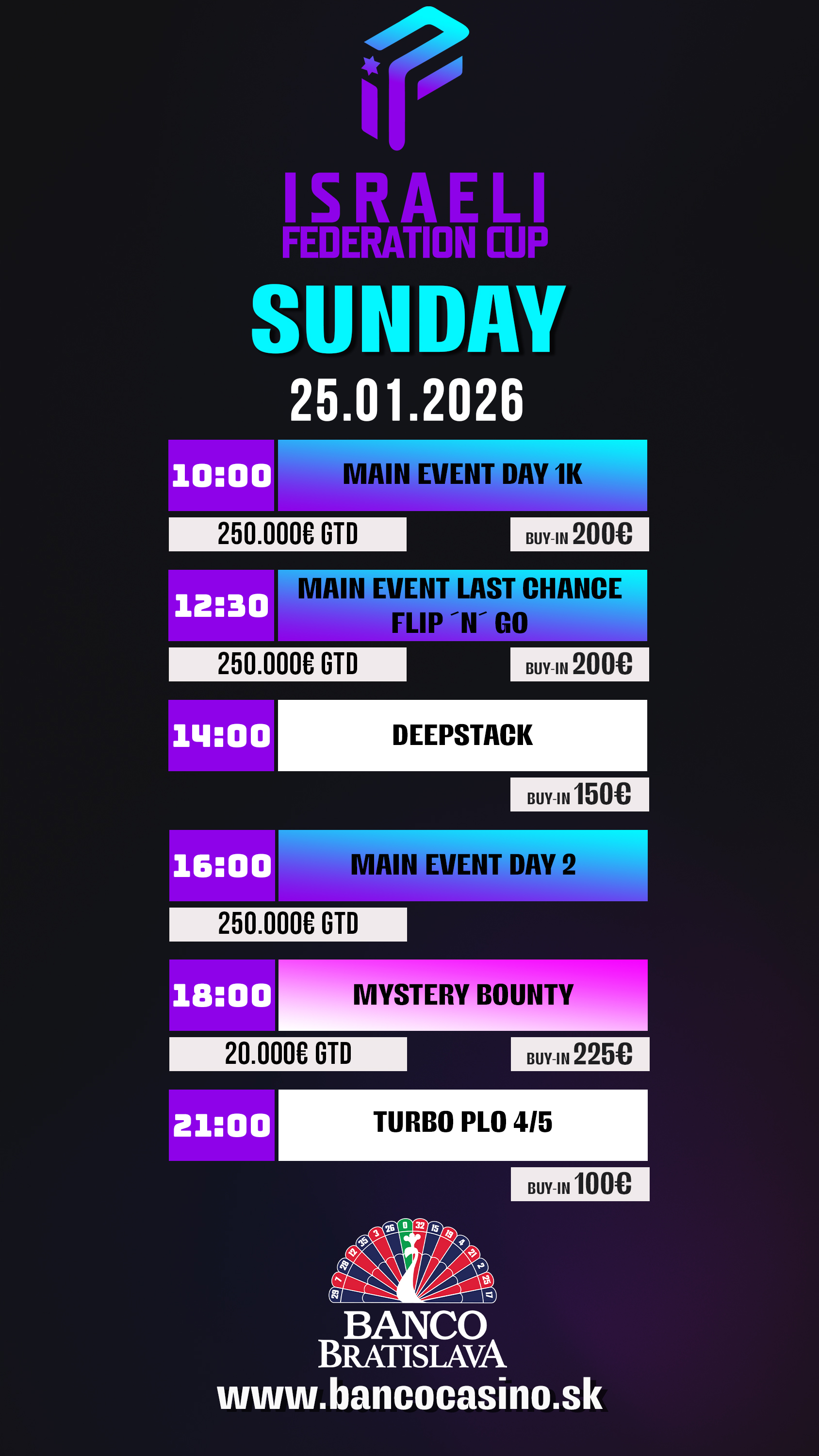 Sobota tradične priniesla najväčšiu účasť a včerajší deň v Banco Bratislava zaregistroval až 815 entries, čo znamená, že v tomto momente prizepool Main Eventu Israeli Federation Cupu presahuje hranicu 340.000€. Skvelá správa pre postupujúcich, ktorí budú bojovať o nádherné výhry. Chcete sa medzi nich prebojovať? Skúste poslednú šancu v podaní Hyper Turbo Flightu so štartom od 10:00 hodiny. Posledná možnosť ako sa stať šampiónom novinky IFC v Banco Bratislava!