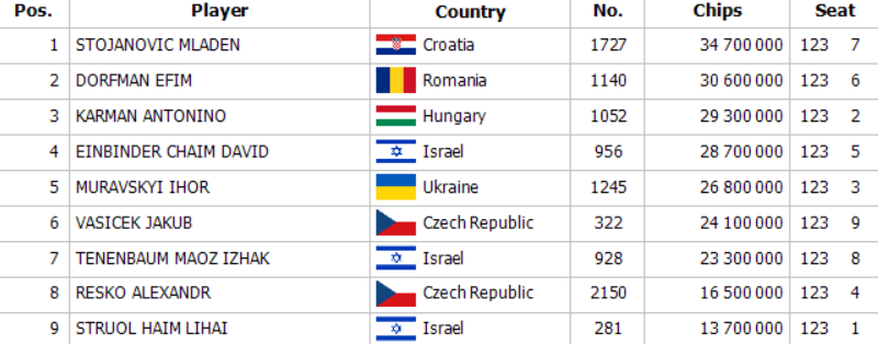 Záverečná 16 členná zostava zasadla za posledné dva stoly od štvrtej hodiny poobednej. Prvou úlohou bolo zostaviť finálový stôl a to sa podarilo po necelých troch hodinách hry. Hráči sa presunuli na televízny stôl pod žiaru reflektorov a drobnohľad kamier. Naďalej pozíciu chipleadera hájil Mladen Stojanovic z Chorvátska.