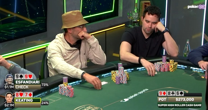 Druhý deň cash game s blindmi $500/$1 000 a $2 000 big blind ante bol absolútne šialený. Na stole lietali šesťciferné poty, viacerí hráči odchádzali predčasne po masívnych stratách a diváci mali čo robiť, aby stíhali sledovať dianie. Napriek množstvu veľkých hier však jedno rozdanie jednoznačne vyčnievalo – dramatický súboj medzi legendárnym Esfandiarim a nevyspytateľným Keatingom.