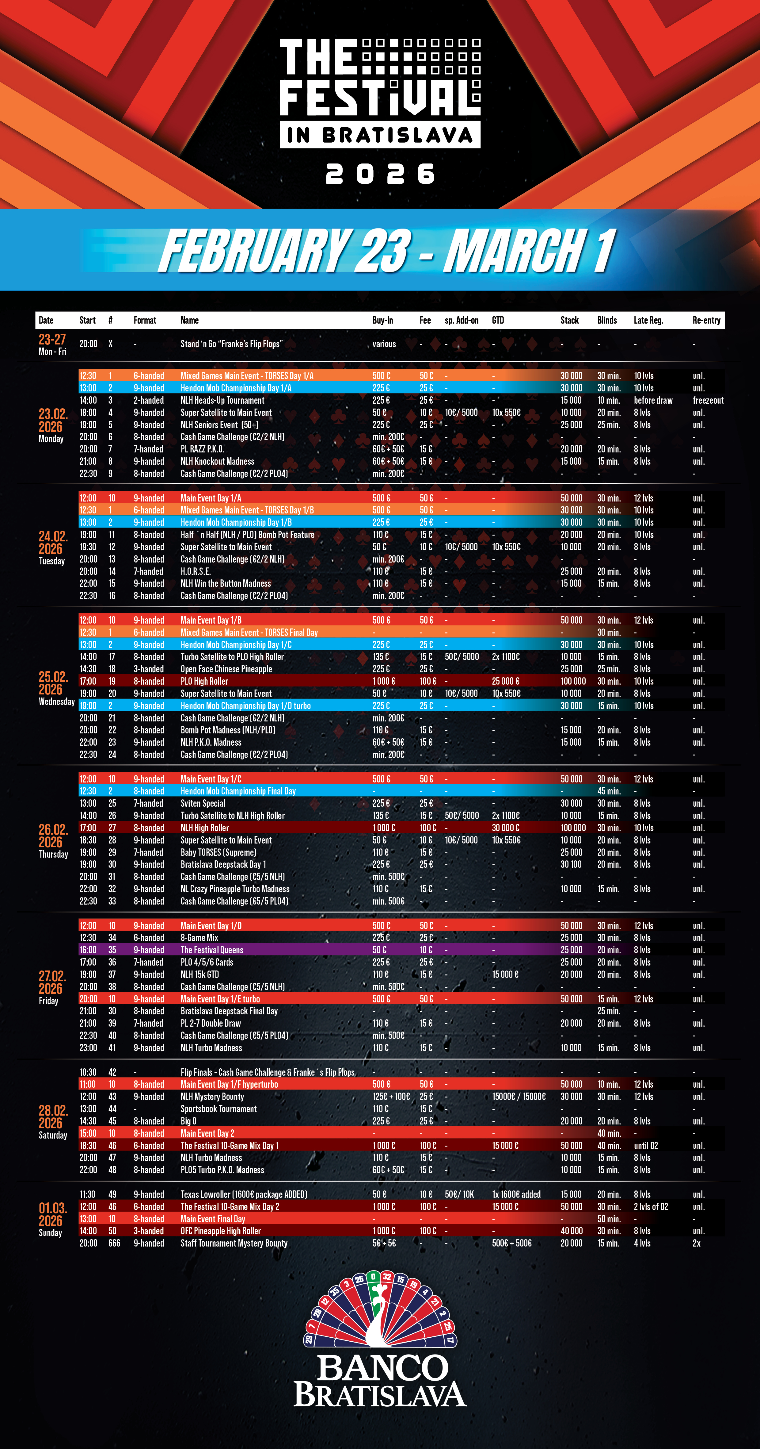 Včera odštartoval aj The Festival Winter Edition – Special (23. február – 1. marec), jedinečný pokerový koncept známy najširším mixom hier a formátov v Európe. RAZZ, HORSES, PLO, Sviten, 8-Game či exkluzívne mixy robia z tohto festivalu povinnú zastávku pre každého, kto miluje rozmanitosť, zábavu a výnimočnú atmosféru. Najrozmanitejší harmonogram celého roku 2026 je tu a vy si môžete zahrať skvelé turnaje či cash games s hráčmi z celého sveta.