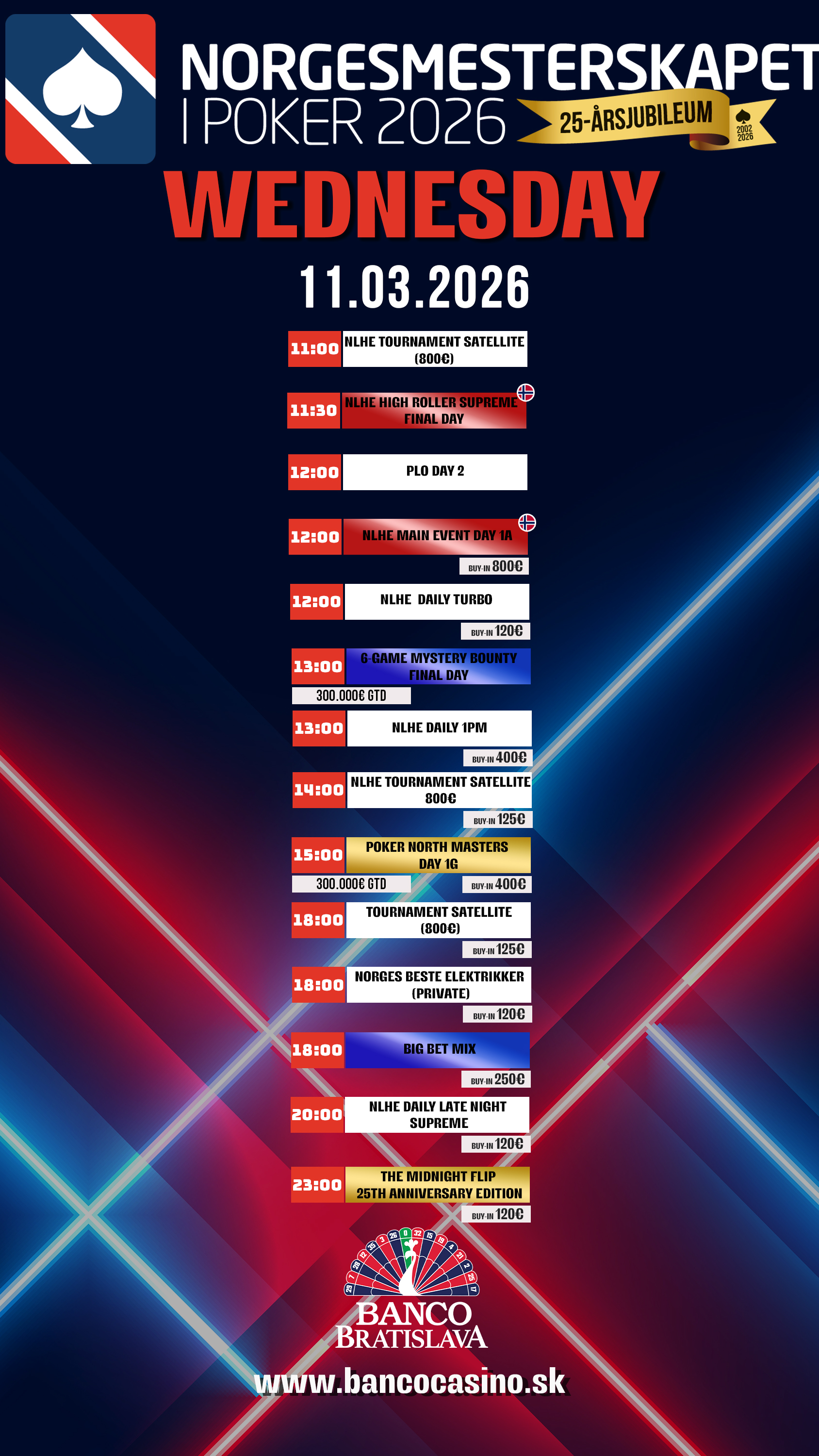 Nórske Majstrovstvá v pokri 2025 prinášajú atraktívnu akciu nielen v turnajovej časti, kde každý deň čaká niekoľko turnajov na svojich šampiónov, ale aj cash game zóna prináša extrémnu akciu počas celého dňa a hrá sa prakticky nonstop.