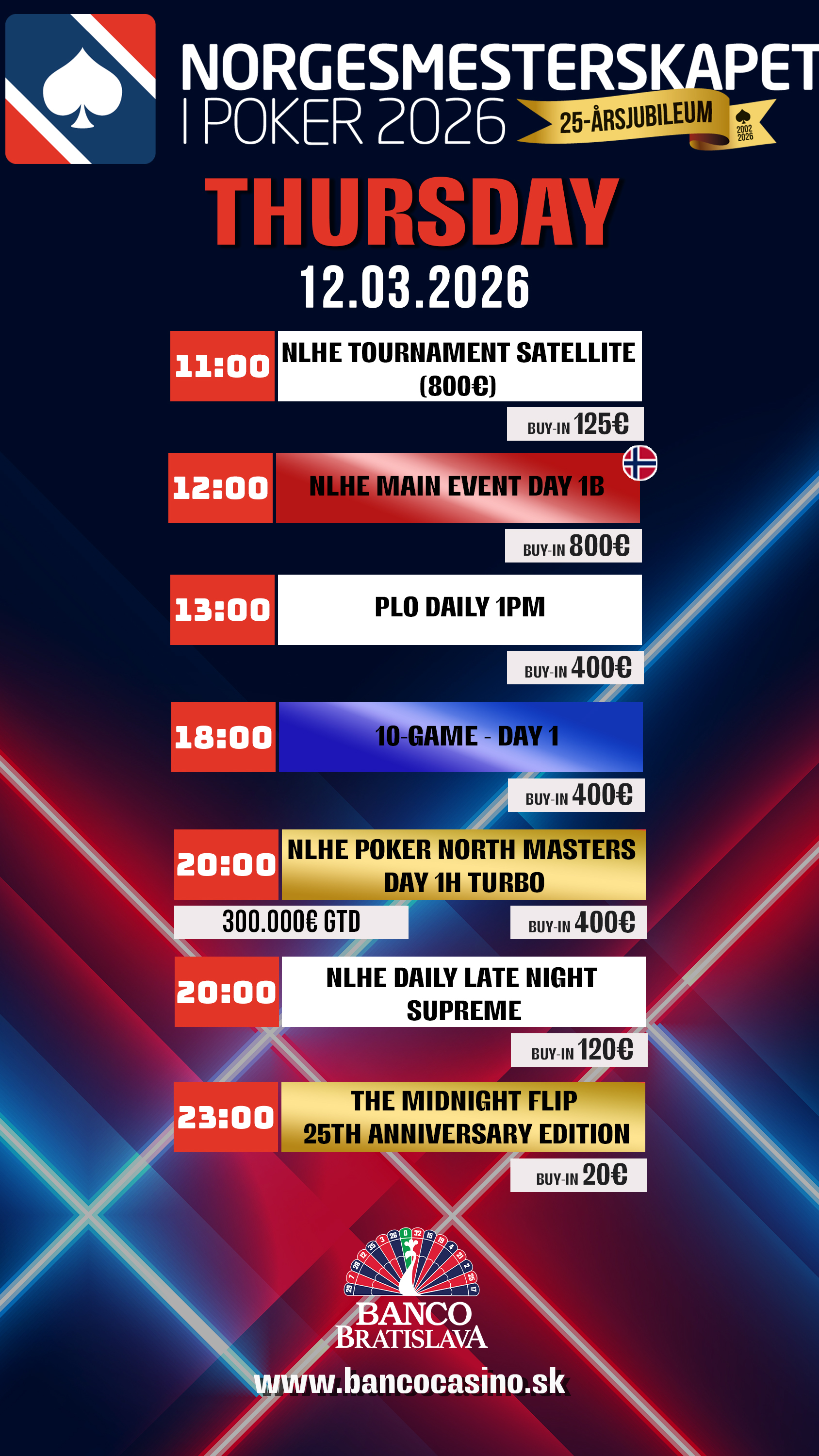 Nórske Majstrovstvá v pokri 2025 prinášajú atraktívnu akciu nielen v turnajovej časti, kde každý deň čaká niekoľko turnajov na svojich šampiónov, ale aj cash game zóna prináša extrémnu akciu počas celého dňa a hrá sa prakticky nonstop.