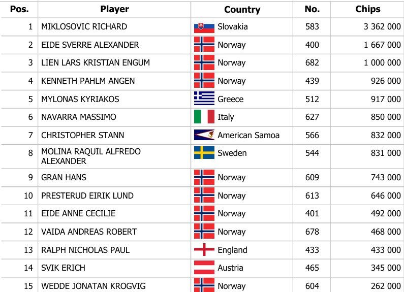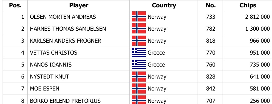 Dnes spoznáme meno nového nórskeho šampióna a takisto aj meno šampióna Poker North Masters, ktorý po včerajšej explózii entries pokoril garantovanú čiastku 300.000€. Včerajší deň priniesol 459 vstupov a my sme spoznali všetkých postupujúcich do dnešného finálového dňa, ktorý štartuje dnes od 13:00 hodiny a my v ňom spoznáme šampióna Poker North Masters.