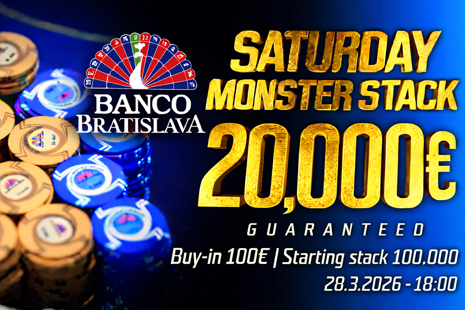 Banco Bratislava prináša pokrové turnaje pre všetkých a dôkazom toho nie sú iba najväčšie eventy v Európe, ale aj skvelé jednodňovky, kde pomer cena výkon láka hráčov zo všetkých strán. Najbližší víkend si pokroví nadšenci zahrajú Super Friday, kde je garancia nastavená na 10.000€ a to len za 50 eurové vstupné. Sobota prinesie Monsterstack až 20.000€ GTD za buy-in 100€, kde na začiatku turnaja prítomní dostanú až 100.000 štartovných žetónov. Banco je tu pre všetkých, ktorí milujú poker!