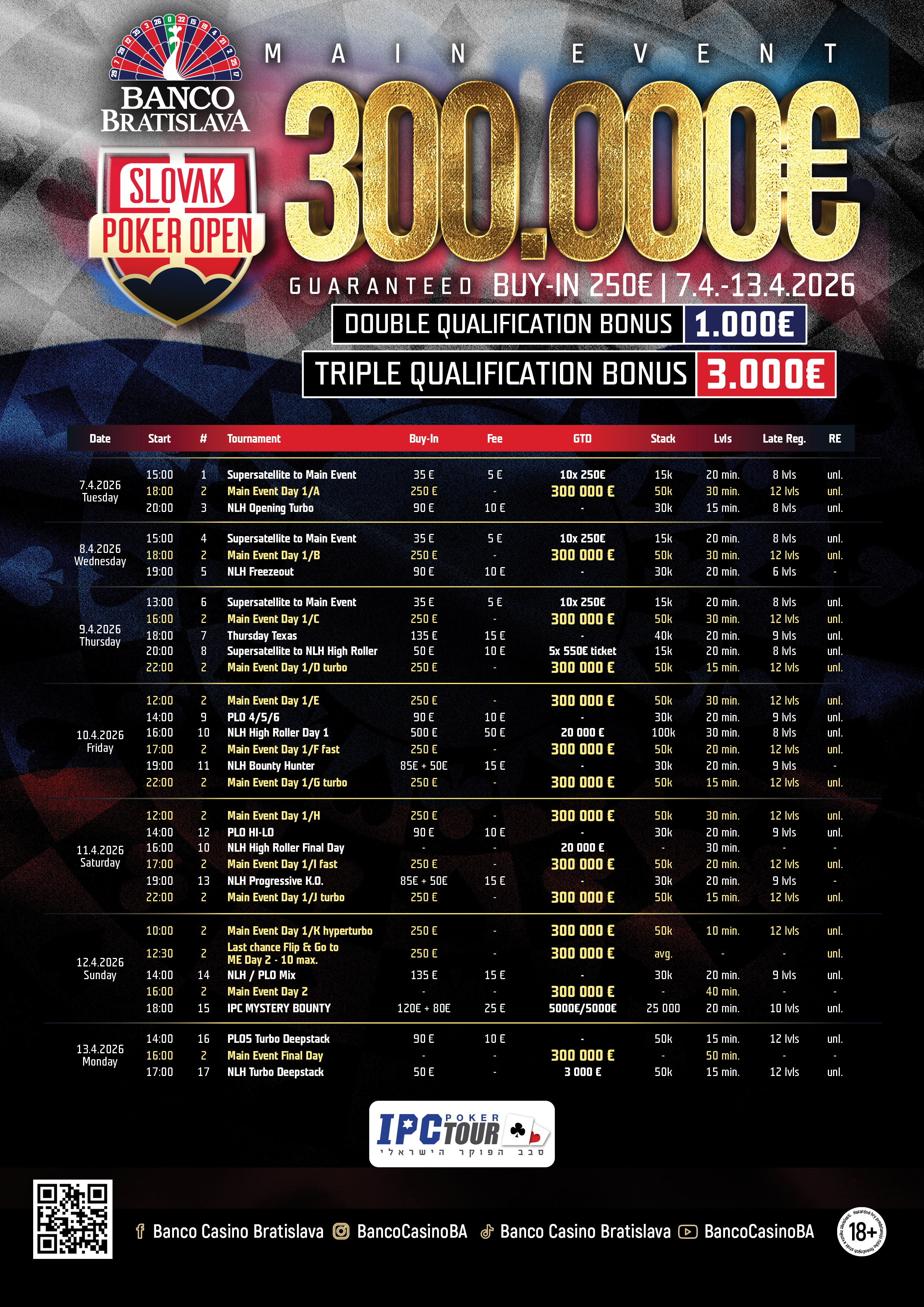 Na Slovak Poker Open plynulo nadviaže ďalší veľký festival – Euro Poker Championship, ktorý sa uskutoční 27. apríla – 4. mája 2026. Aj tu bude hlavným lákadlom Main Event s garanciou 250.000 €, ktorý sa hrá za buy-in 220 € + 30 €. EPC prinesie do Bratislavy hráčov z mnohých krajín a sľubuje týždeň plný kvalitnej turnajovej akcie aj napínavých cash games.