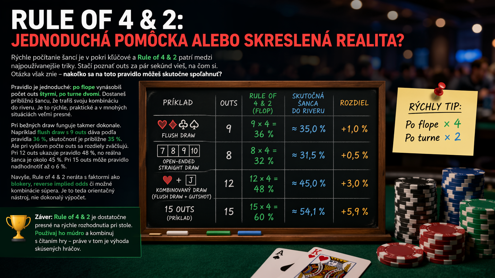 Z praktického hľadiska však Rule of 4 & 2 zostáva mimoriadne užitočné. Je rýchle, jednoduché a v drvivej väčšine situácií dostatočne presné. Najlepšie funguje pri klasických draw (8–10 outs), kde sú odchýlky minimálne. Skúsení hráči ho využívajú ako základný odhad, ktorý si následne upravujú podľa konkrétnej situácie pri stole.