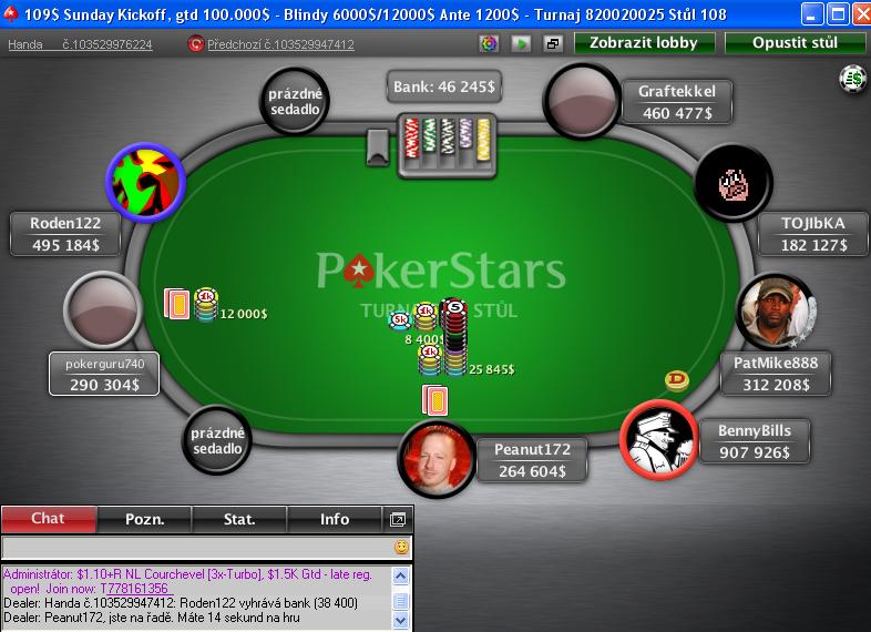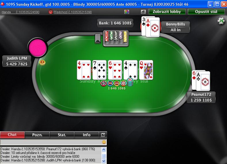 Prehľad toho najlepšieho z online herní, čo sa počas víkendu podarilo Sk/Cz hráčom, začneme opäť tým najlepším. Český hráč "BennyBills" zopakoval svoju nedávnu účasť na finálovom stole turnaja $109 Sunday Kickoff a po skvelom výkone skončil nakoniec tretí. Spolu s ním sa dlho držal v tomto turnaji aj slovenský hráč "Roden122", ktorému ušla účasť na finálovom stole iba o vlások, keď ho nepodržalo Q-Q a musel sa s turnajom rozlúčiť na 13. mieste za $1,033. Český hráč "BennyBills" si naopak v záverečnej fáze turnaja počínal excelentne a dostal sa až do TOP 3 turnaja. Tam mu už hra až tak nešla a po viacerých nevydarených hrách poslal celý svoj stack (800K - blindy 30K-60K-ante 6K) do hry z malého blindu s A