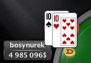 Ďalší zaujímavý výsledok dosiahol "rasmiras", ktorého najlepší vysledok v herni P****Stars bol do včera desiate miesto z turnaja s buy-inom $0.55, keď vyhral $24! Dnes skoro ráno sa to všetko zmenilo a "rasmiras" si z turnaja $1,10+R NLHE 3xTurbo (štart denne 20:15 - garancia $60K) odniesol životnú výhru $9,931, keď skončil druhý. Turnaj je vždy veľkým lákadlom pre hráčov, čo potvrdila aj včerajšia účasť 16,925 hráčov.