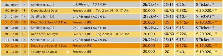 Prvý turnaj série Deep Stack Days odštartuje už v pondelok (30.9.) o 19:00 turnajom za €330 a garanciou €30,020. Štartovací stack je nastavený na 30,000 žetónov a levely sú 40/60 minútová. Druhý hrací deň tohoto turnaja začne v utorok od 17:00. Ak sa chcete do turnaja kvalifikovať cez satelit, využite možnosť už od 14:00 (30.9.), kde pri buy-ine €26 (€20 unl. rebuy/ addon) je v hre 5 ticketov.