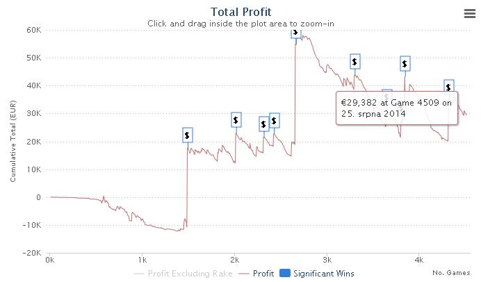 Skvelú formu z poslených mesiacov si aj naďalej udržiava známy český online MTT regulár Martin "elof24" Dvořák. Tento hráč sa počas augusta dostal na 13 veľkých finálových stolov, vyhral turnaj Big $109 za $19,918 a dohromady si už počas augusta zarobil z MTT turnajov vyše $50,000! Celkovo je tento hráč v herni P****Stars v profite €29,382 pri priemernom ROI 1,3%. Graf jeho výkonov je dole pod textom.