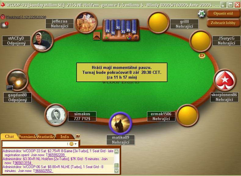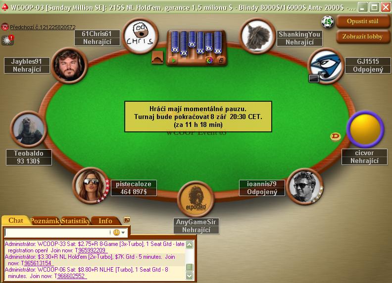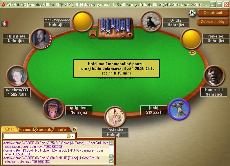 Najzaujímavejšie sa pre Sk/Cz hráčov vyvíja tretí včera rozohratý Event. V turnaji WCOOP-03: $215 Sunday Million postúpilo do dnešného finále hneď 9 českých hráčov a traja Slováci "jnbhj", "matiko09" a "cicvor".
