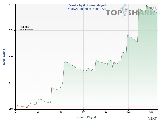 Najzaujímavejší výkon predviedol "Study23" v herni Pa***Poker, kde dokázal vyhrať turnaj Middleweight: $3,000 Gtd 6Max Turbo Rebuy hneď trikrát v priebehu siedmich dní! To je naozaj pozoruhodný výsledok! V tejto herni je "Study23" najaktívnejší a aj jeho profit je práve tu najvyšší. Od začiatku roku sa dostal do zisku $7,118 pri priemernom ROI 128%. (odohral 125 turnajov)