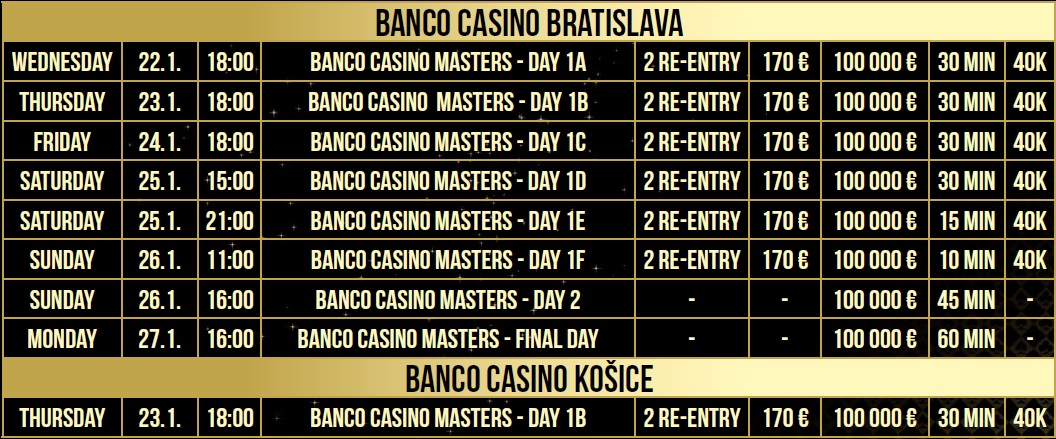 Tradične v stredu štartuje najväčší pravidelný pokrový turnaj na našom území, ktorého už 21. edícia odštartovala včera v Banco Casino Bratislava. Banco Casino Masters po dvadsiatyprvý krát nesie kráľovskú garanciu 100,000 eur a to len za vstupné 170 eur. Všetci, ktorí sa aktívne zapoja do turnaja, tak ich vstupné sa rozmení na 40,000 štartovných žetónov. Tie musia pretaviť do čo najväčšieho stacku v úvodných dňoch, a ak sa prebojujú hráči aj do najúspešnejších 10% z celkového počtu entries, tak postup do Day 2 je zaručený!