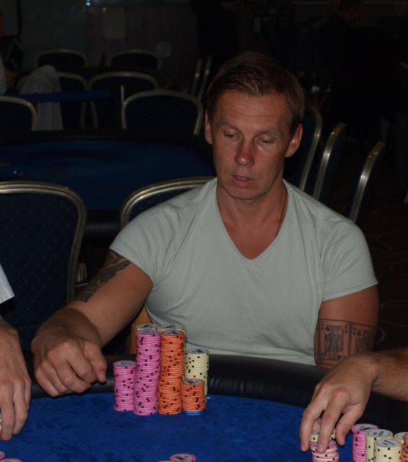 Petráš pushol, nevytočil a je out. Vedľa otvoril Rajsek, Letko pretočil na 18,000 a BB Gabovič vysunul 70,000. Rajsek zahodil, Letko dlho tankoval, no zahodil tiež. Ďaľší stôl otváral Palovič na 9,000 a Páleník vysunul 56,000 s osmičkami. Palovič si nechal prerátať stack, chvíľu komentoval a dorovnal s T-4. Board K-3-5-Q-4 mu nepomohol a Páleník ostáva v hre. Peťo Koreň si s A-Q zahral o všetko. Proti nemu však stáli kingy a na odpor sa postavil aj blank board.