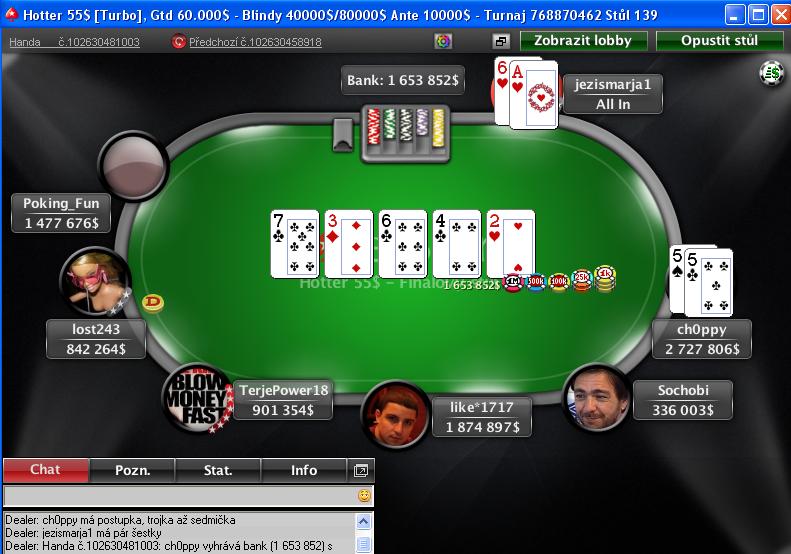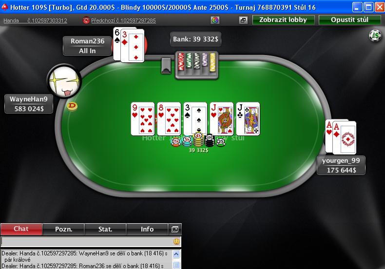 Najlepší výsledok nedeľňajšej noci dosiahol český P****Stars Pro Martin "AABenjaminAA" Hrubý, ktorý sa dokázal dostať až do záverečného heads-upu turnaja $215 Sunday Warm Up, kde si to rozdal o výhru $102,616 s Mexičanom "PokerSavage1". Pred záverečnou hrou celého turnaja mal Martin 5,3M žetónov a jeho súper, ktorý bol v masívnom chipleade 26,6M. Blindy boli 400K/800K. Martin bol prvý na rade a poslal all in s %Kd%-%Jd%. Jeho súper dorovnal a ukázal %As%-%Th%. Flop...